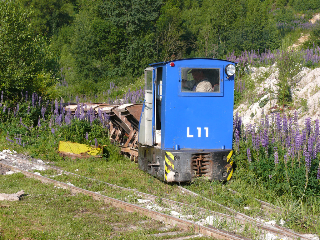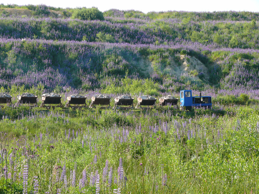 Lokomotiva DNH-I-7-35 L15 (001) odváží soupravu naložených vozů z těžebního prostoru Nová Ves
