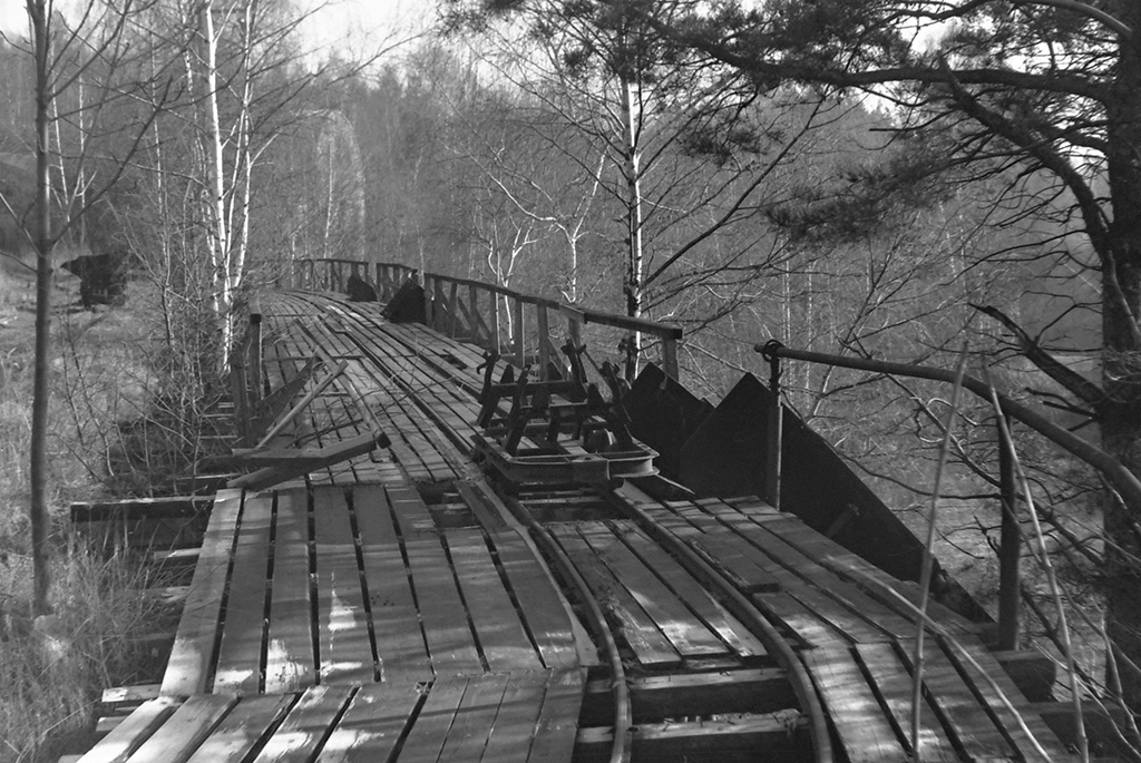 Úzkorozchodná dráha a opuštěné výklopné vozy v areálu žulových lomů