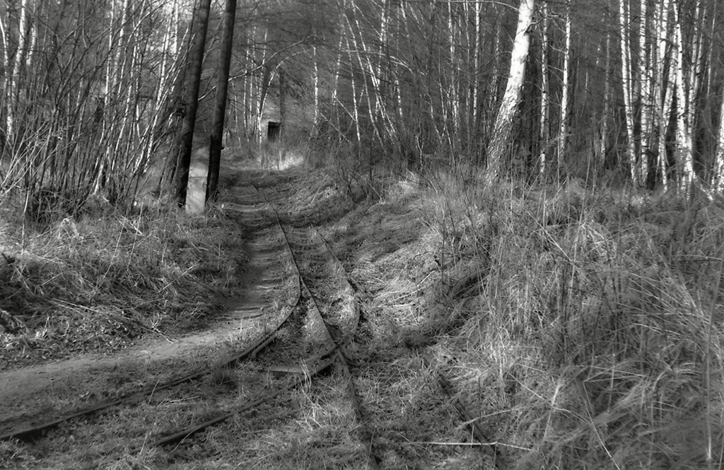 Úzkorozchodná dráha s opuštěnými vozy v areálu žulových lomů