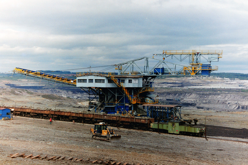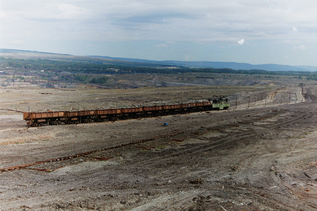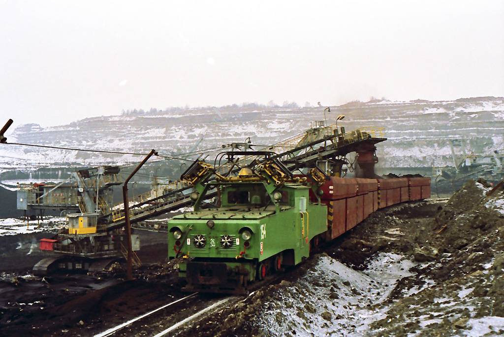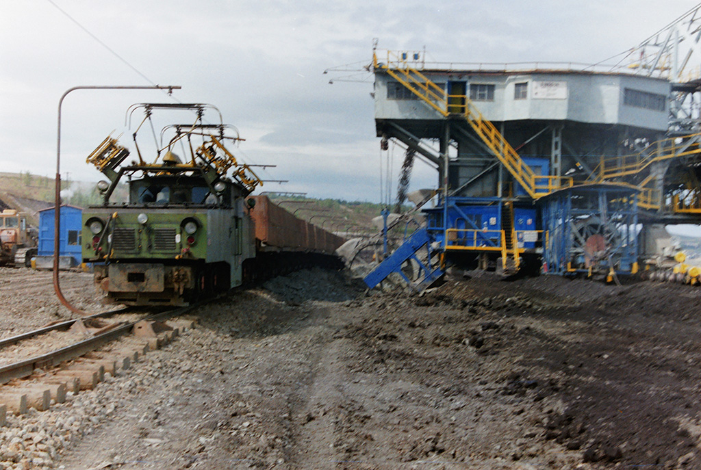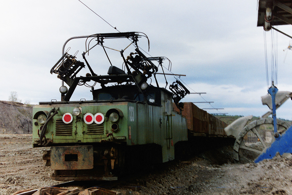 Vlak s lokomotivou 17E č.148 během nakládky pod kolesovým rypadlem v lomu Medard