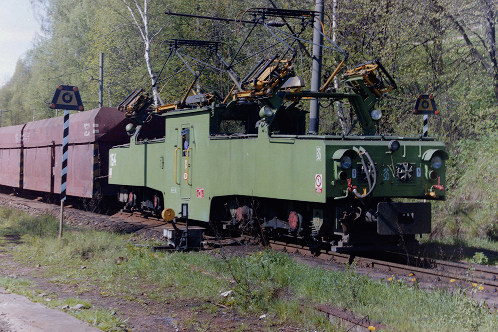 17E č.304 se soupravou vozů v kolejišti lomu Medard-Libík