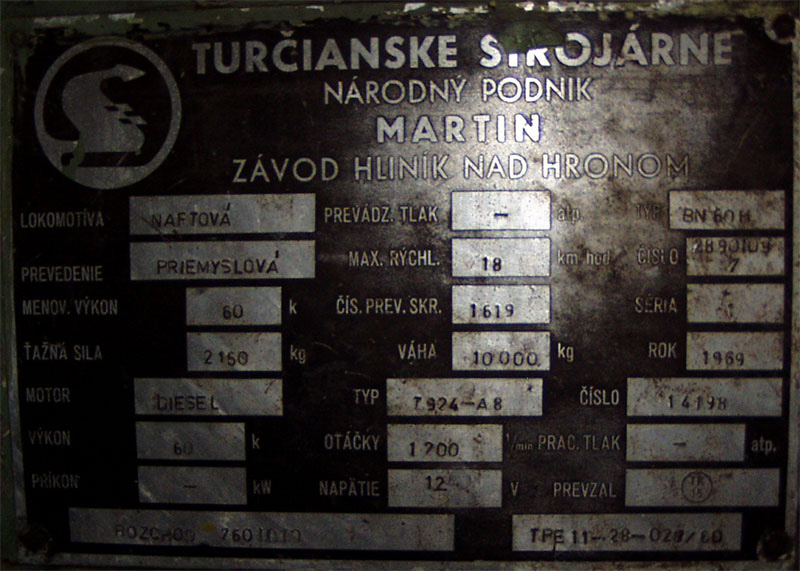 | Výrobní číslo | Rok výroby | Výrobní štítek |