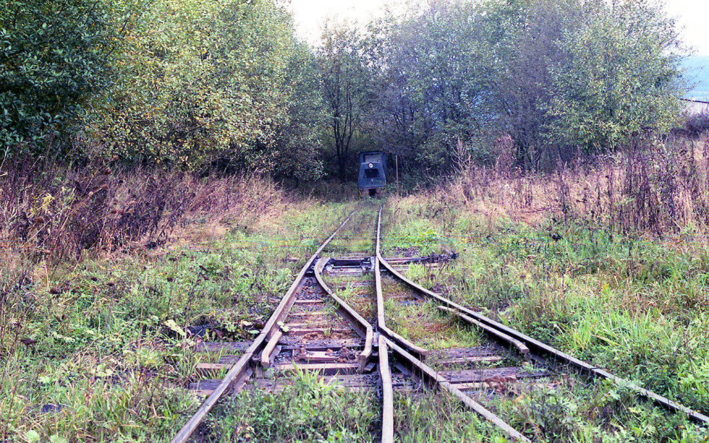 Větvení trati v areálu cihelny s odstavenou lokomotivou BN30R (032) v pozadí