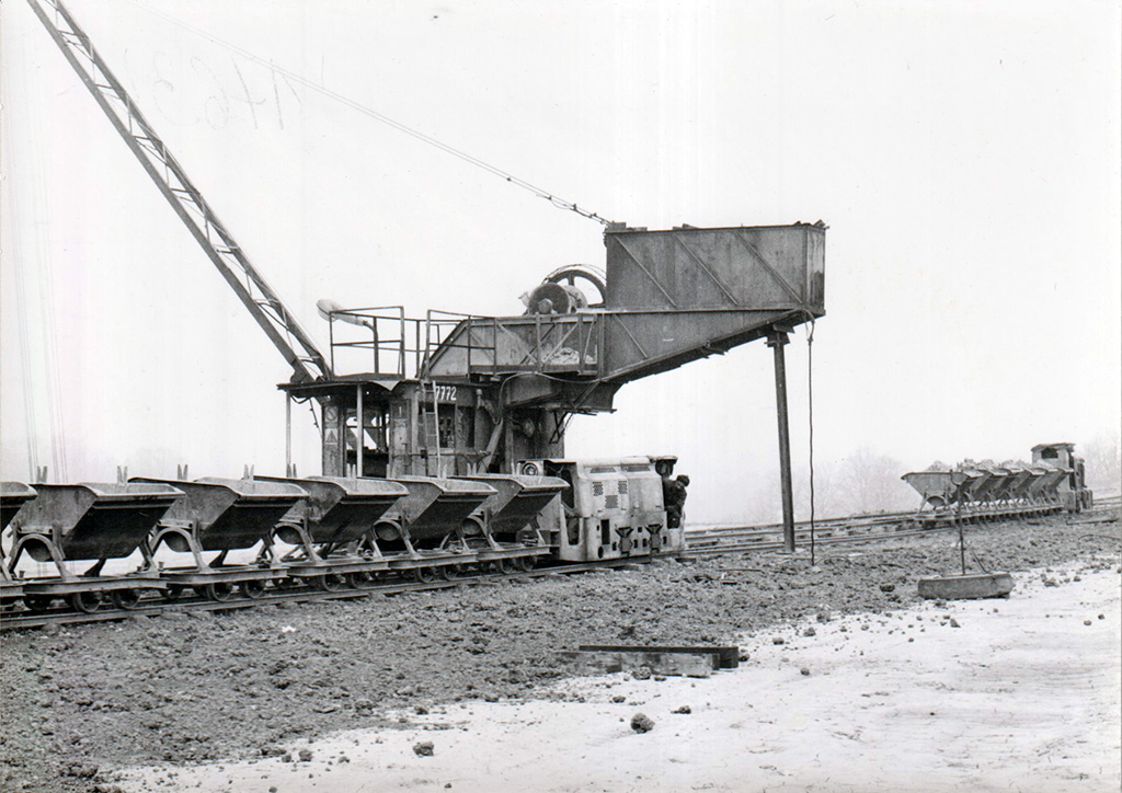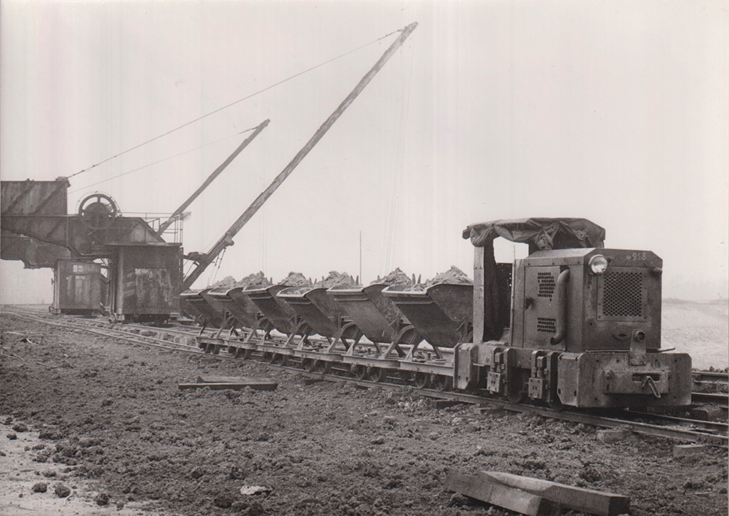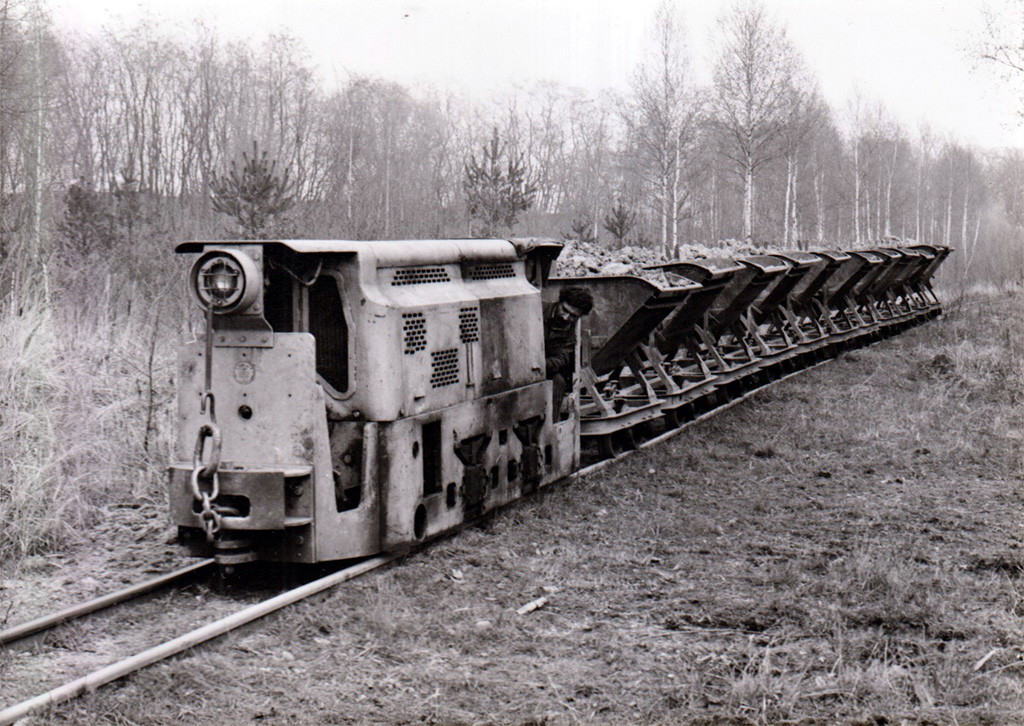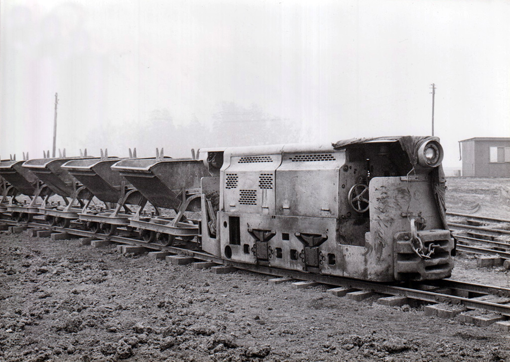 Prázdná souprava s lokomotivou BND30 a naložená souprava se strojem BN30 v hliništi
