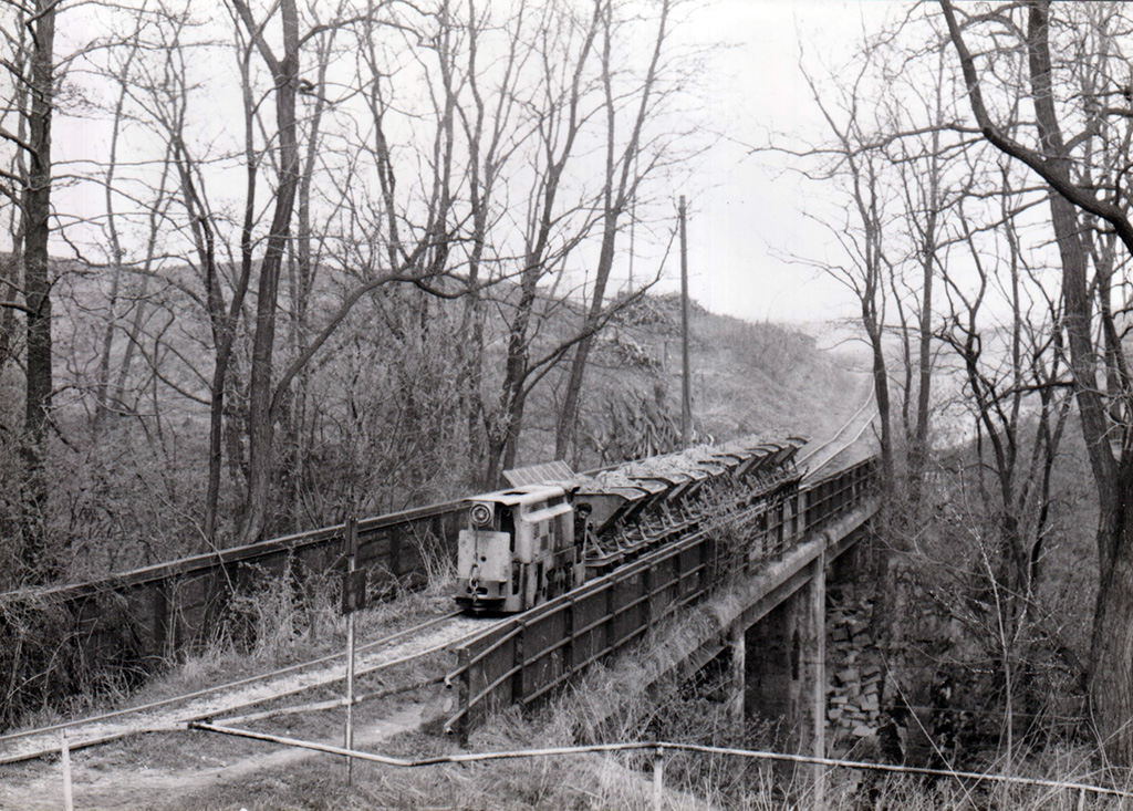 Naložená souprava s lokomotivou BND30 jedoucí přes most směrem k cihelně
