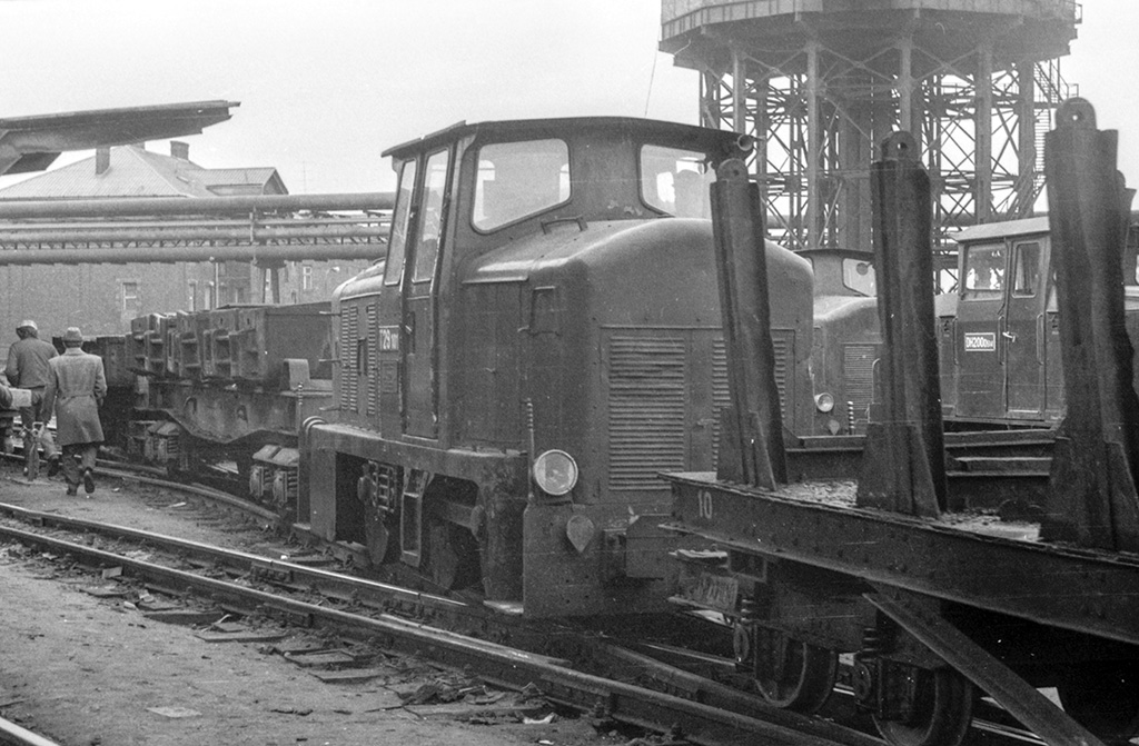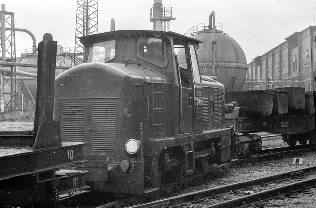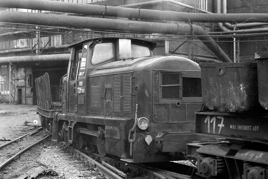 Lokomotivy T29.101 a v pozadí DH200.0508 při posunu v areálu železáren
