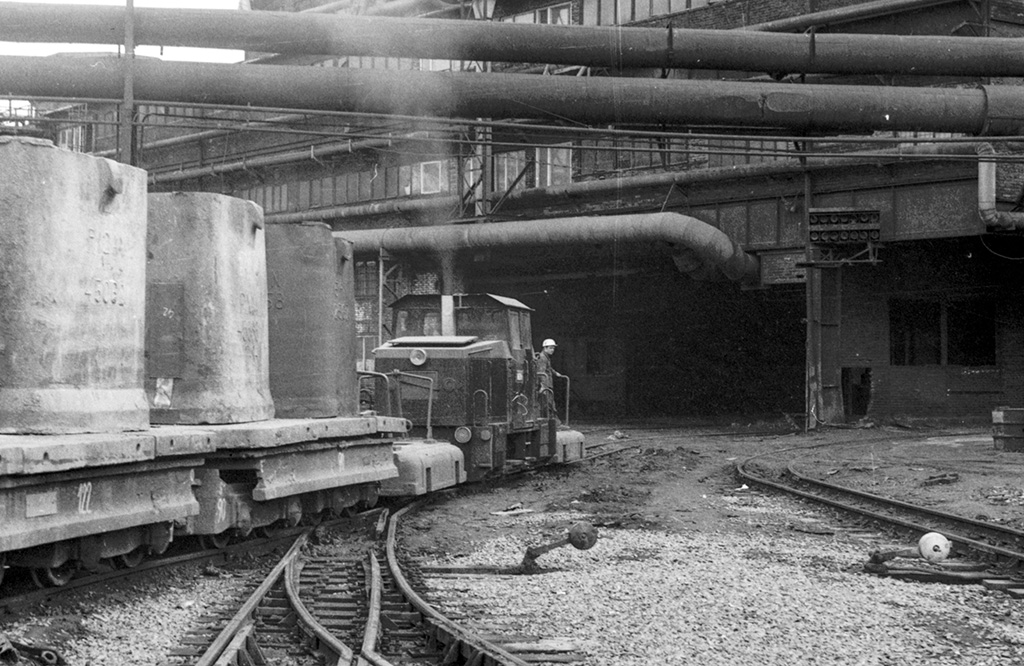 Lokomotiva DH200 s vozy v areálu železáren