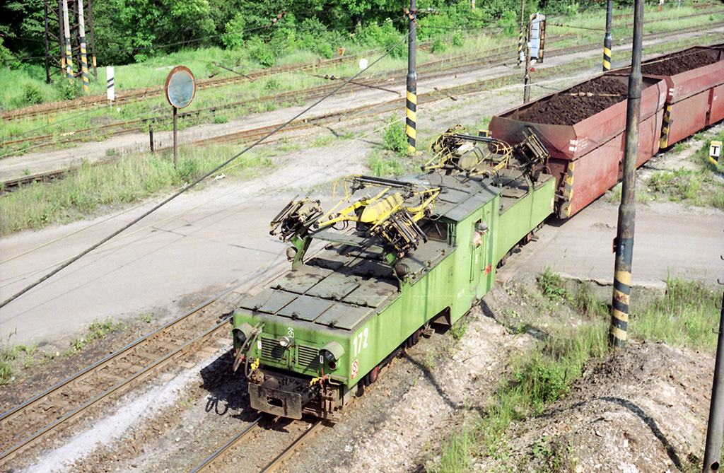 Netradiční pohled na lokomotivu 17E č.172 se soupravou ložených vozů ve Svatavě