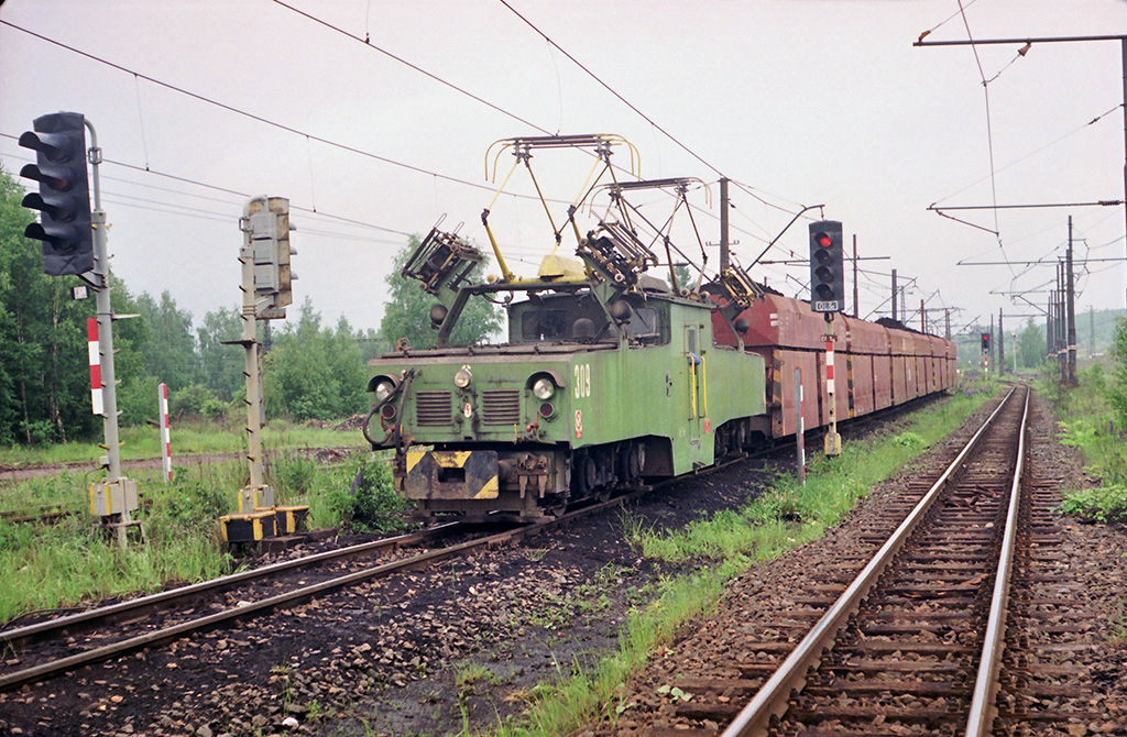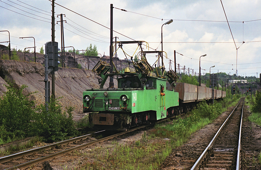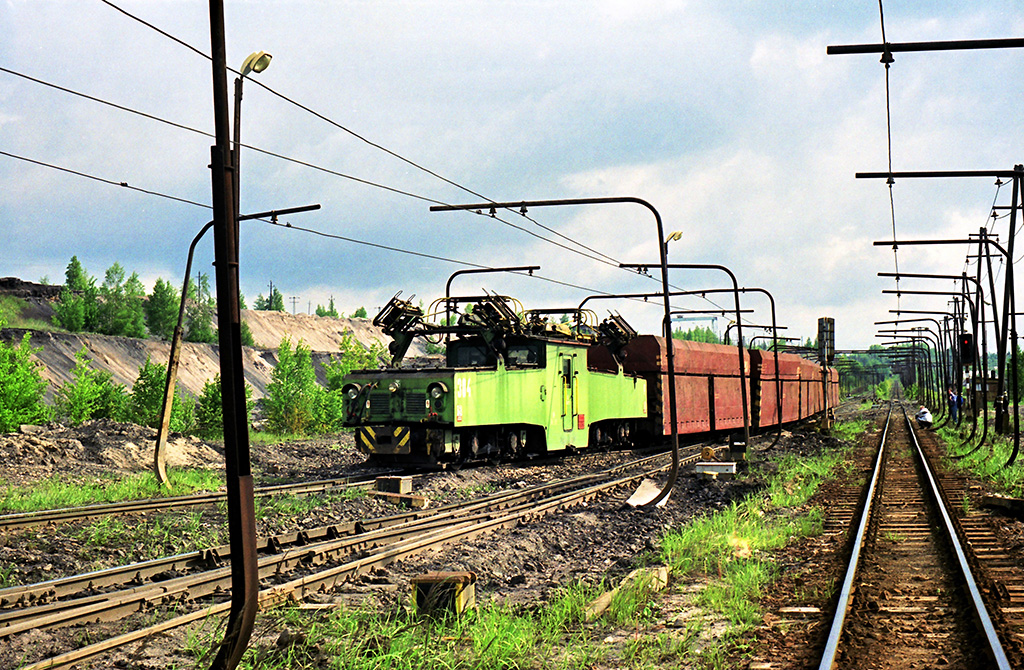 17E č.304 se soupravou vozů v kolejišti lomu Medard-Libík