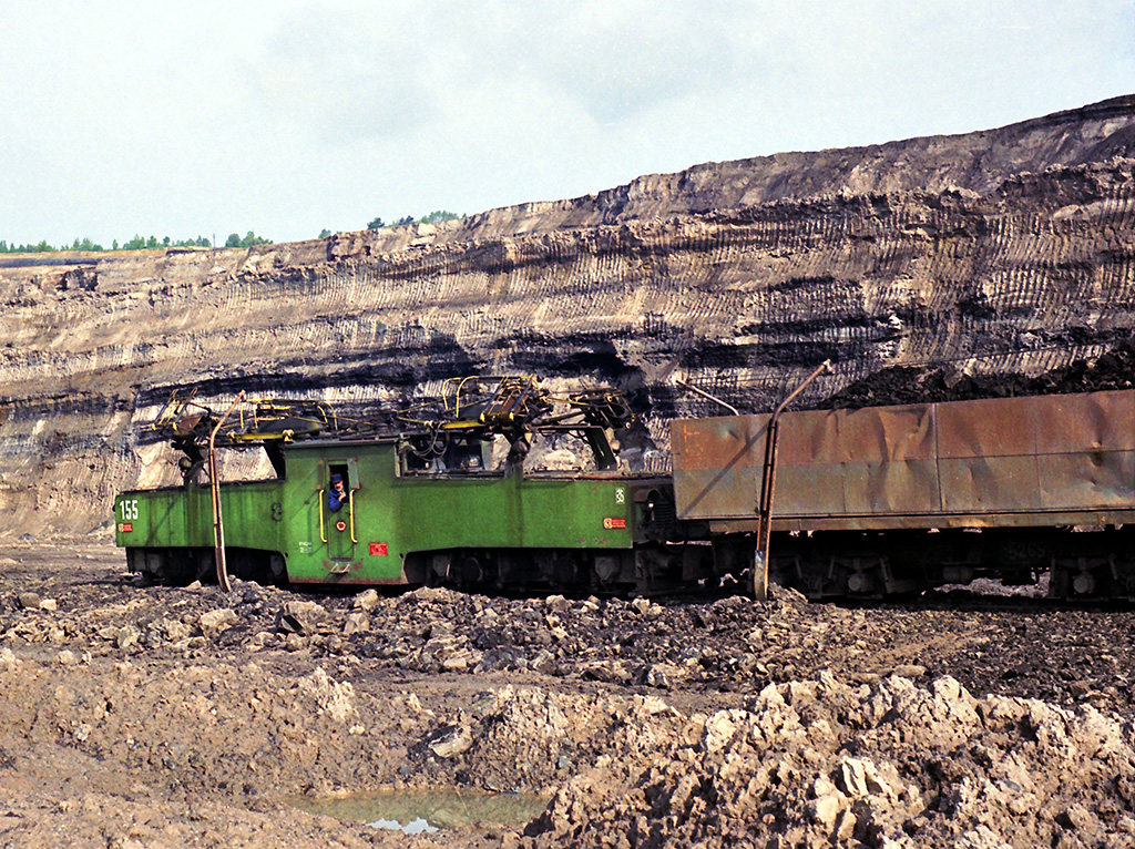 17E č.155 se soupravou vozů projíždí kolejištěm lomu Medard-Libík