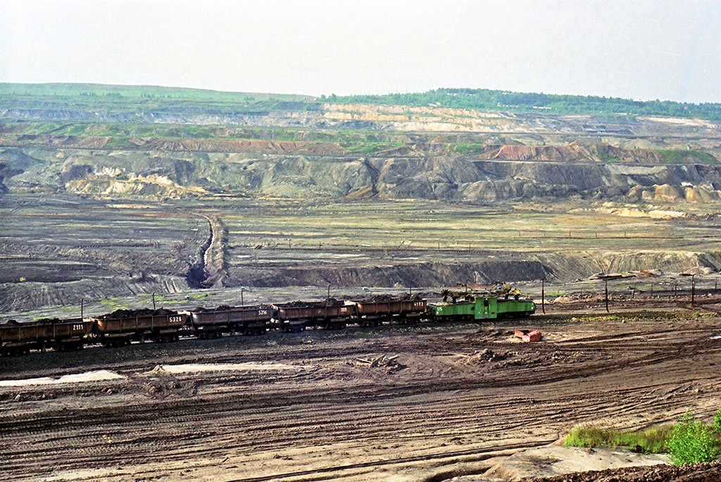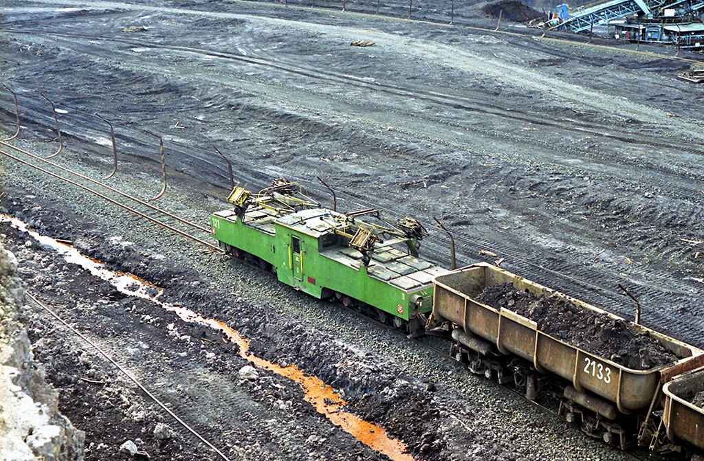 Vlak s lokomotivou 17E č.148 během nakládky pod kolesovým rypadlem v lomu Medard