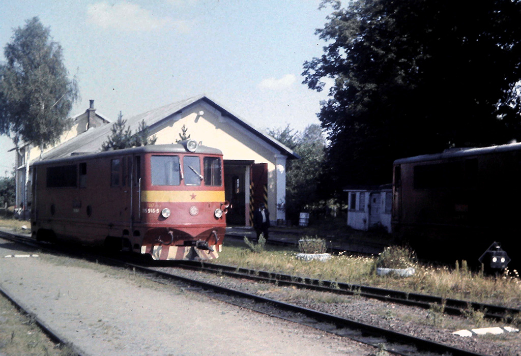 Lokomotiva 705.916 (006) projíždí okolo depa ve stanici Osoblaha