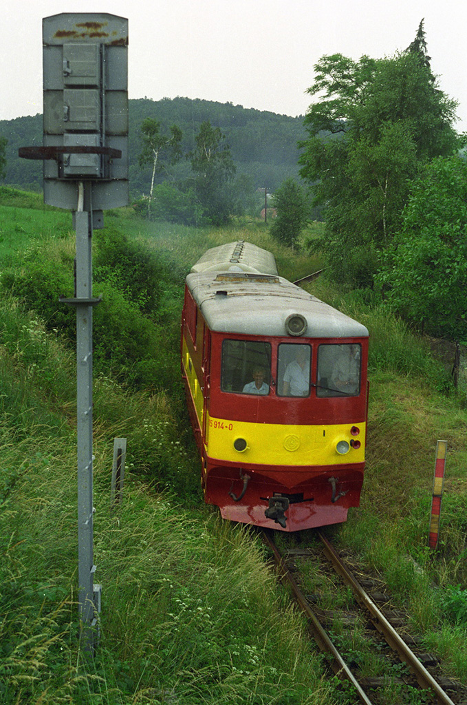 Osobní vlak s lokomotivou 705.914 (008) projíždí kolem vjezdového návěstidla do stanice Třemešná ve Slezsku