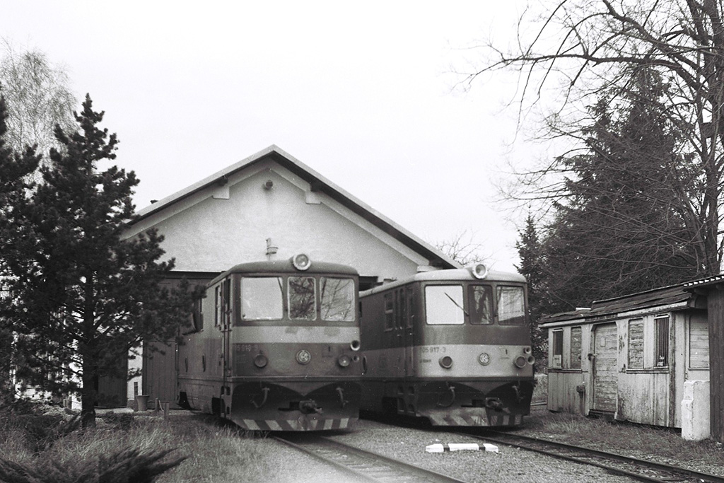Lokomotivy 705.919 (011) (vlevo) a 705.917 (005) před remízou v Osoblaze