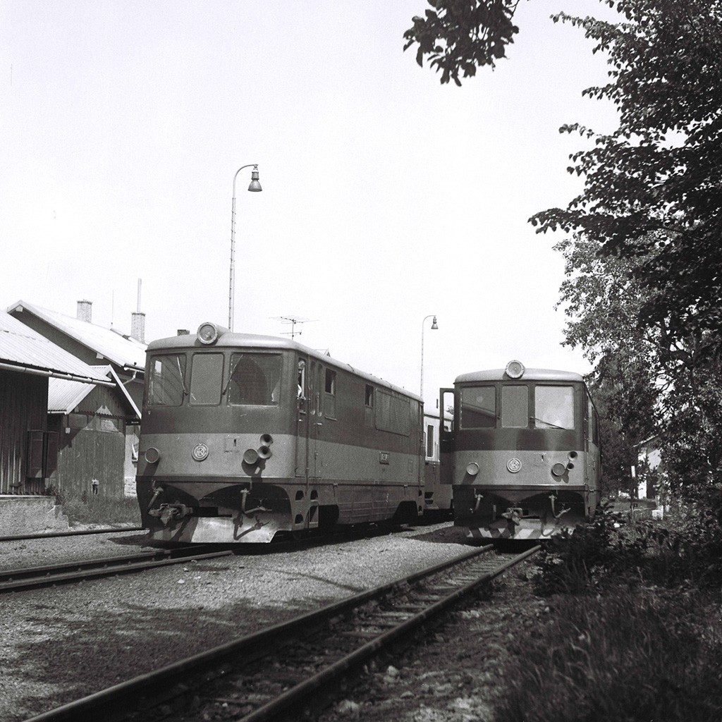 Setkání lokomotiv 705.914 (008) (vlevo) a 705.913 (009) ve stanici Osoblaha